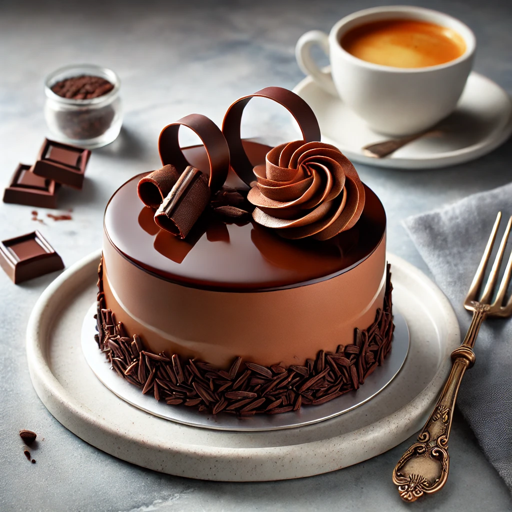 - 우아한 비주얼: 초콜릿 글레이즈로 덮인 매끈한 외관과 초콜릿 컬, 과일 등의 장식은 고급스러움을 더합니다.