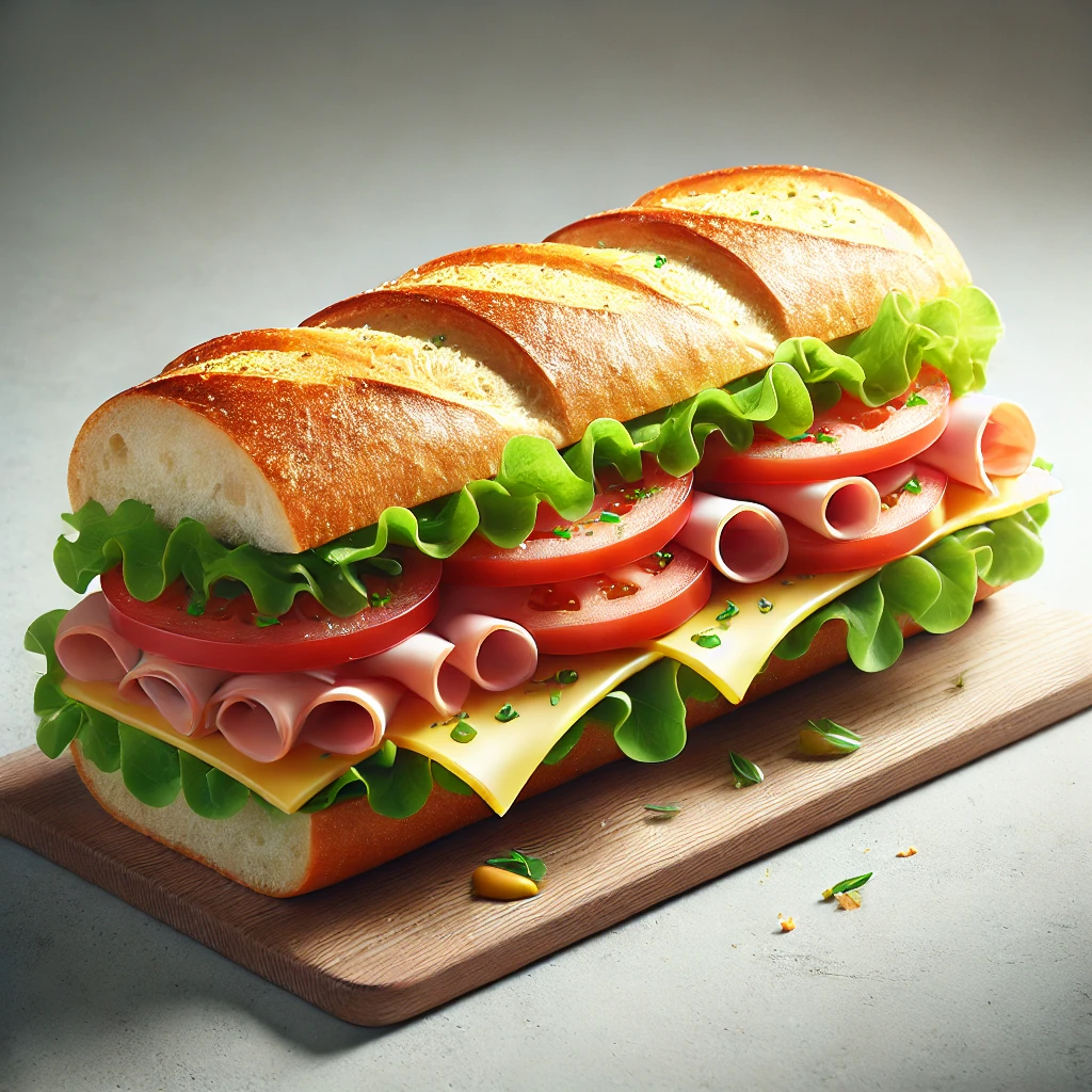 바게트를 세로로 잘라 햄, 치즈, 신선한 채소를 넣어 간단하고 맛있는 샌드위치를 만듭니다. - 브루스케타: