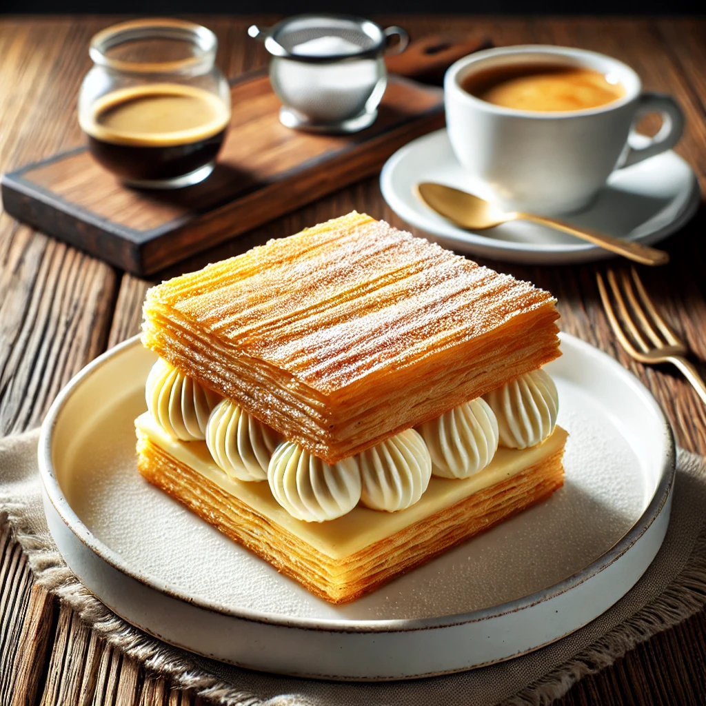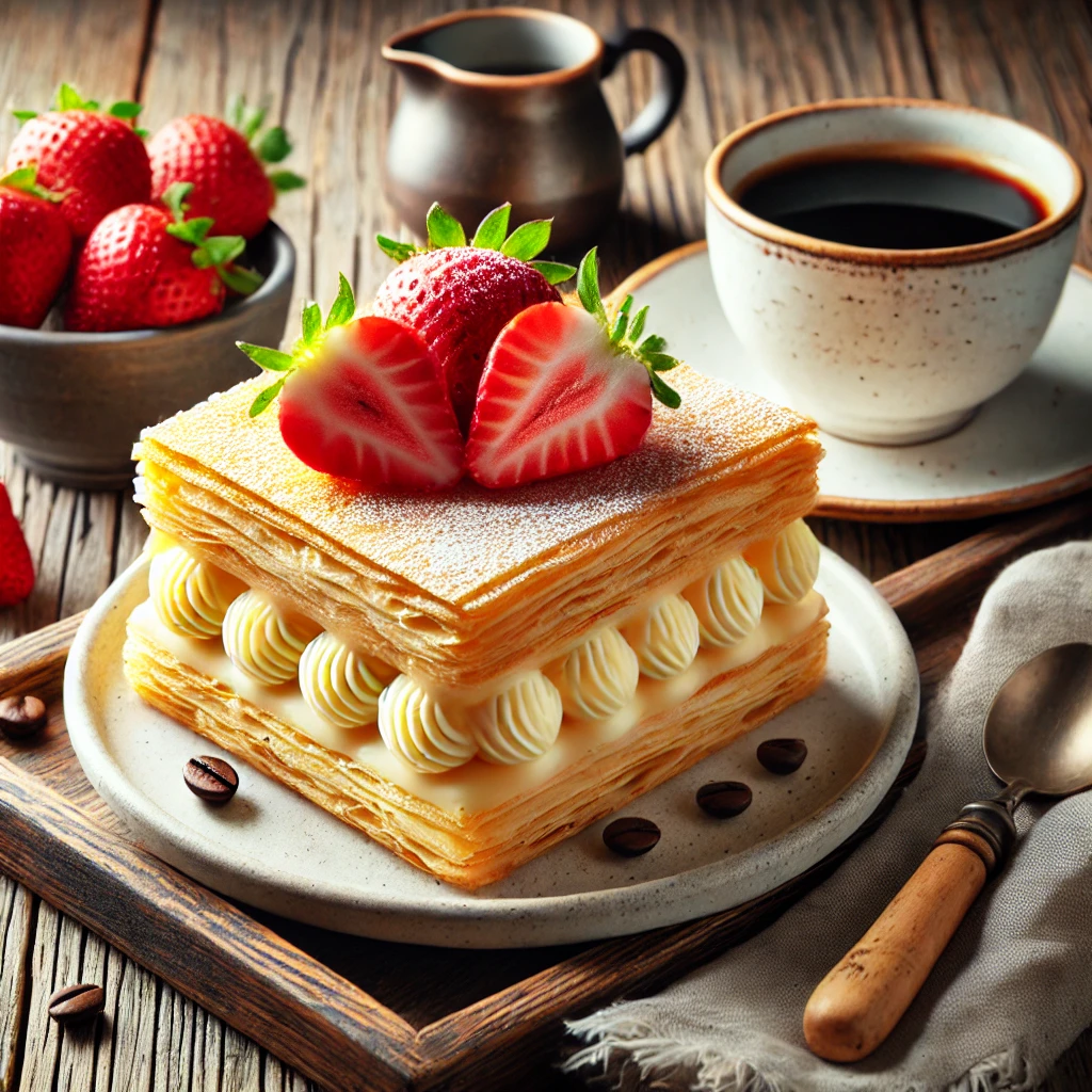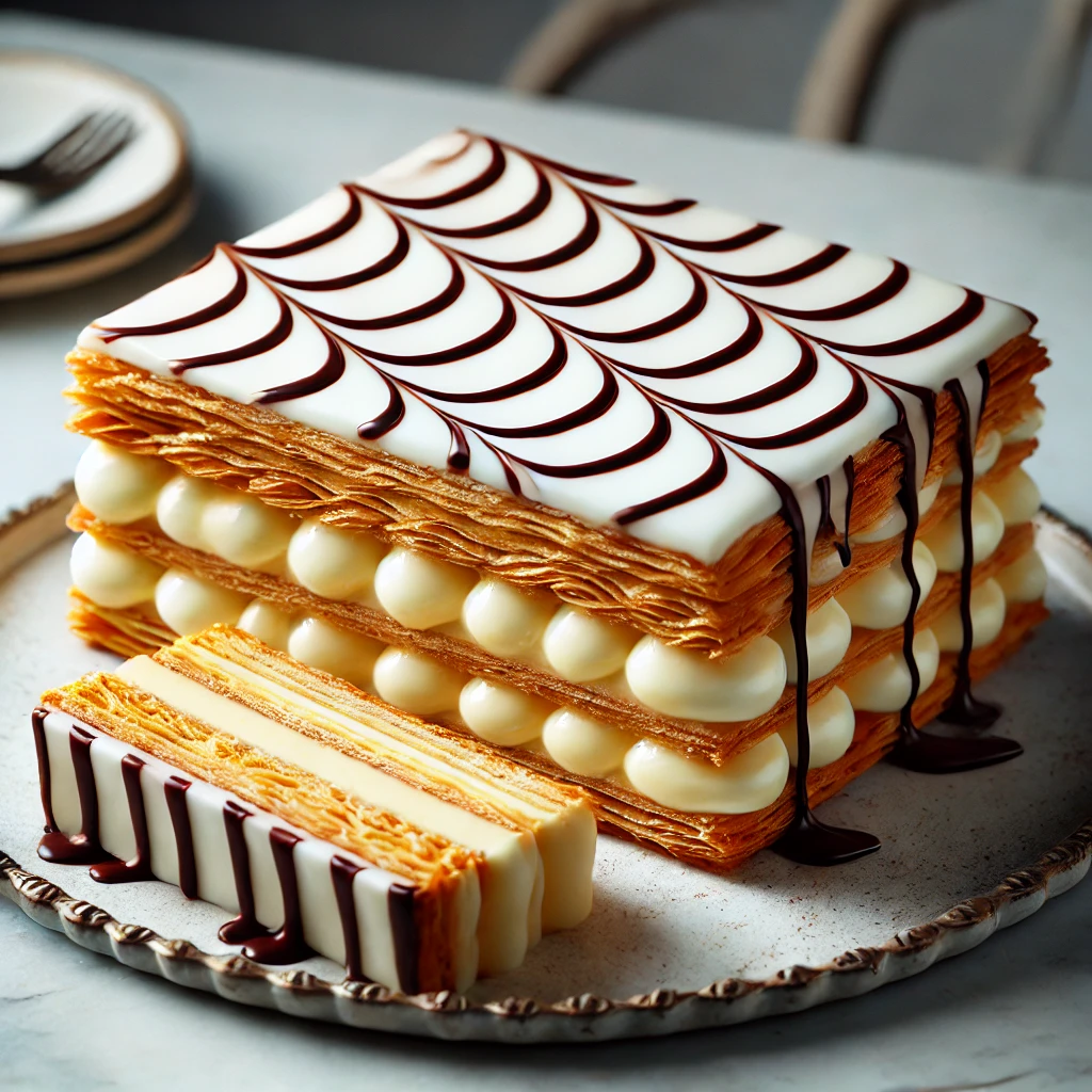 밀푀유는 프랑스어로 "천 개의 잎사귀"라는 뜻을 가진 디저트로, 얇고 바삭한 페이스트리 층과 부드러운 크림이 정교하게 쌓인 고급스러운 디저트입니다. 클래식 밀푀유는 바닐라 커스터드 크림과 설탕 글레이즈 또는 초콜릿 스트라이프 장식이 특징이며, 그 우아한 외형과 조화로운 맛으로 전 세계적으로 사랑받고 있습니다.