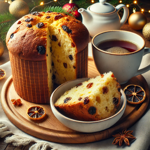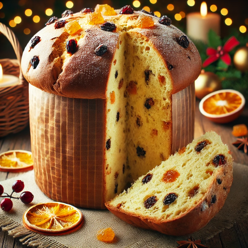 파네토네는 이탈리아의 대표적인 크리스마스 빵으로, 높고 둥근 돔 모양이 특징이며, 건포도, 설탕에 절인 오렌지 껍질, 말린 과일 등이 듬뿍 들어간 달콤한 디저트 빵입니다.